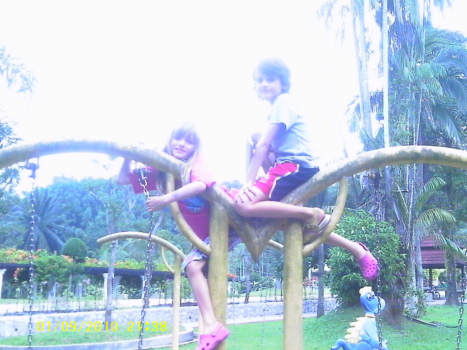 I had a day off from school for National Malaysia Day which is Malaysia's Independence from Great Britain day. We went to a playground at Lake Gardens in Kuala Lumpur. I started swinging without anyone pushing me. The same thing happened with Alice. If you look in the picture you'll see that I climbed to the top of the swings on my own. It was a really good playground for gymnastics. There were these bridges, I climbed off them, swung, made it to the bottom of them and swung to the ground.